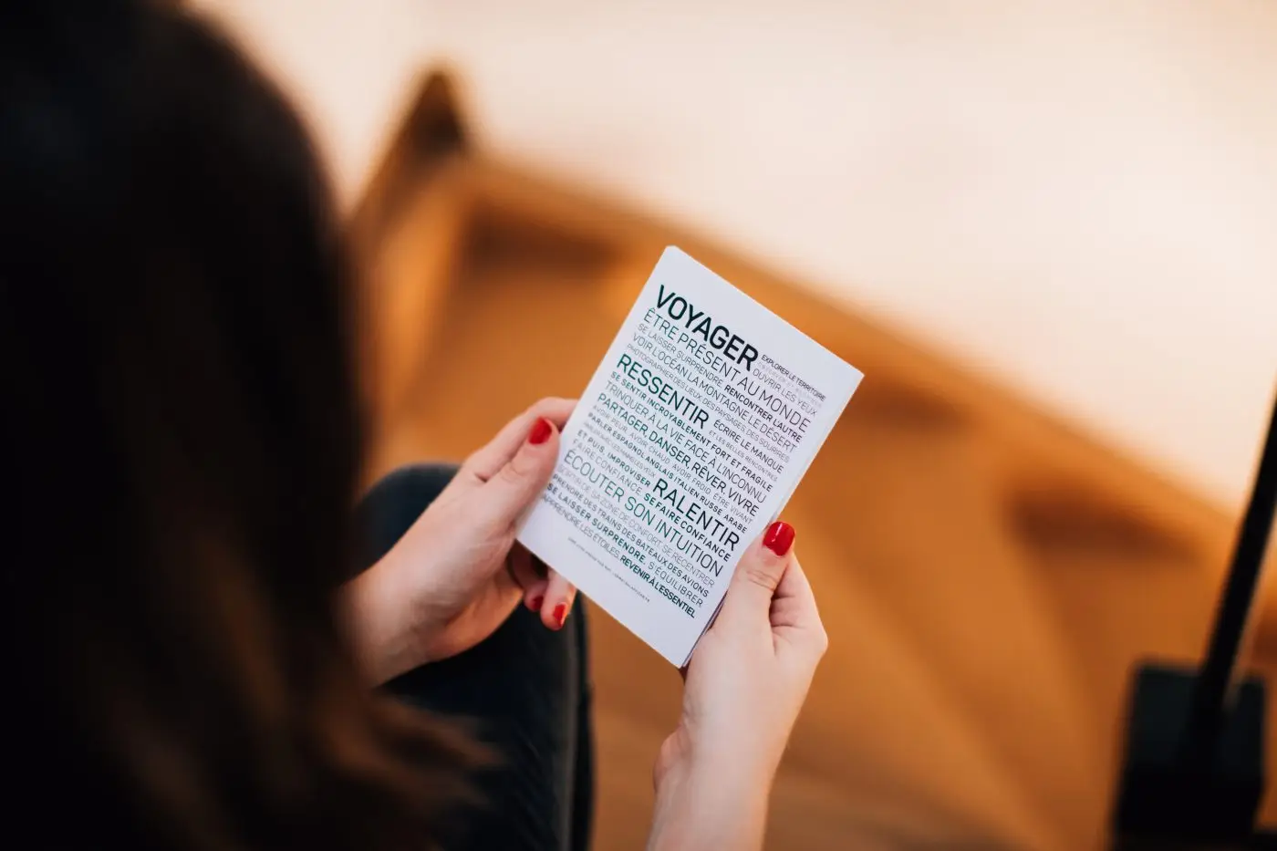 Depuis que j’ai créé cette affiche et carte postale sur le voyage, je l’utilise souvent quand je pars en vacances pour l’envoi de mes cartes postales. J’ai toujours un lot dans mon carnet « au cas où ».