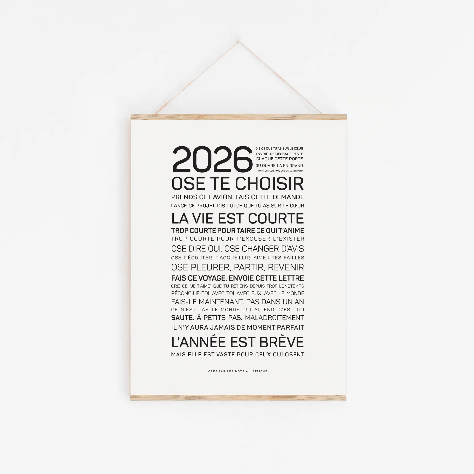 L’affiche 2026 – Ose te choisir fait partie de la collection de vœux Les mots à l’affiche : des affiches poétiques et symboliques, pensées comme des talismans de début d’année.
