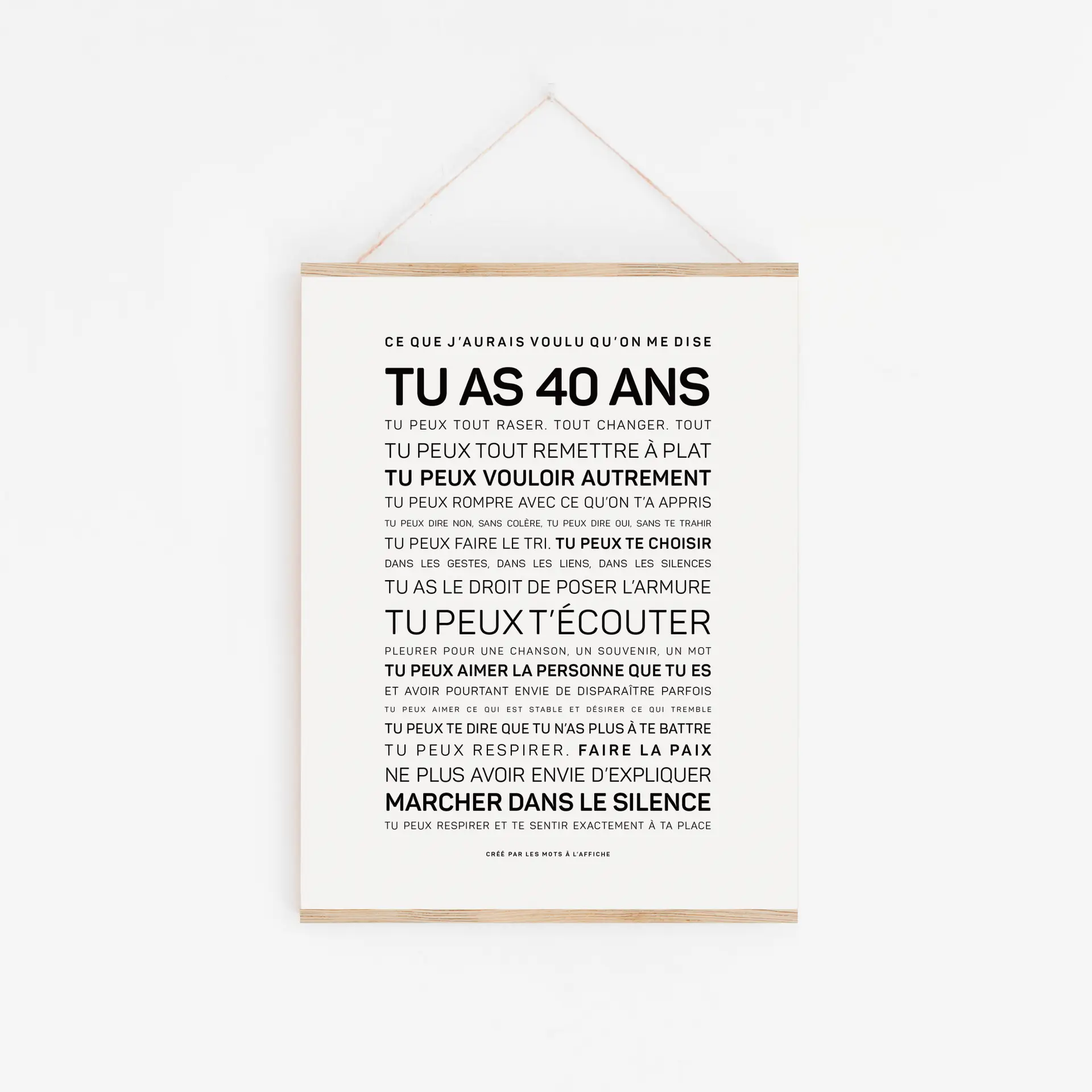À 40 ans, on atteint souvent un point charnière de sa vie : un équilibre fragile entre ce que l’on a construit et ce que l’on aspire encore à vivre. L’affiche « Ce que j’aurais voulu qu’on me dise – 40 ans » de Les mots à l’affiche met en mots cette étape avec justesse et émotion.
