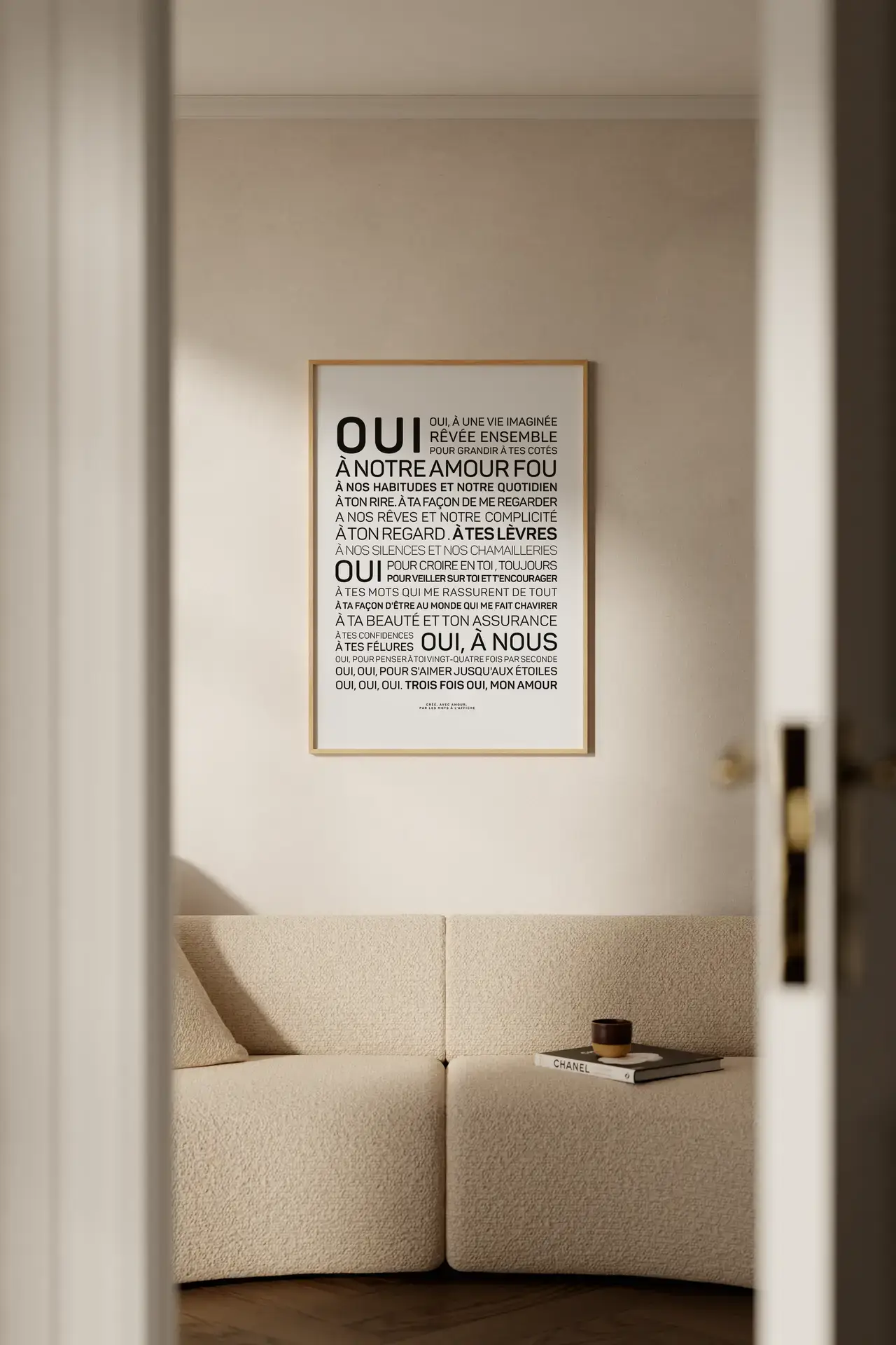 Des mots pour se dire oui, chaque jour. Des mots pour s’aimer en majuscules. Des mots sur une affiche comme un mantra pour se souvenir de son amour immense et de son engagement envers l’autre.