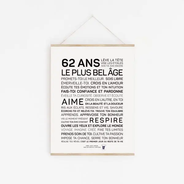Une affiche magique, un cadeau pour soi ou à offrir, pour ses 62 ans, ou à offrir, pour se rappeler, chaque jour, combien la vie est belle, fragile et précieuse quand on a soixante ans.