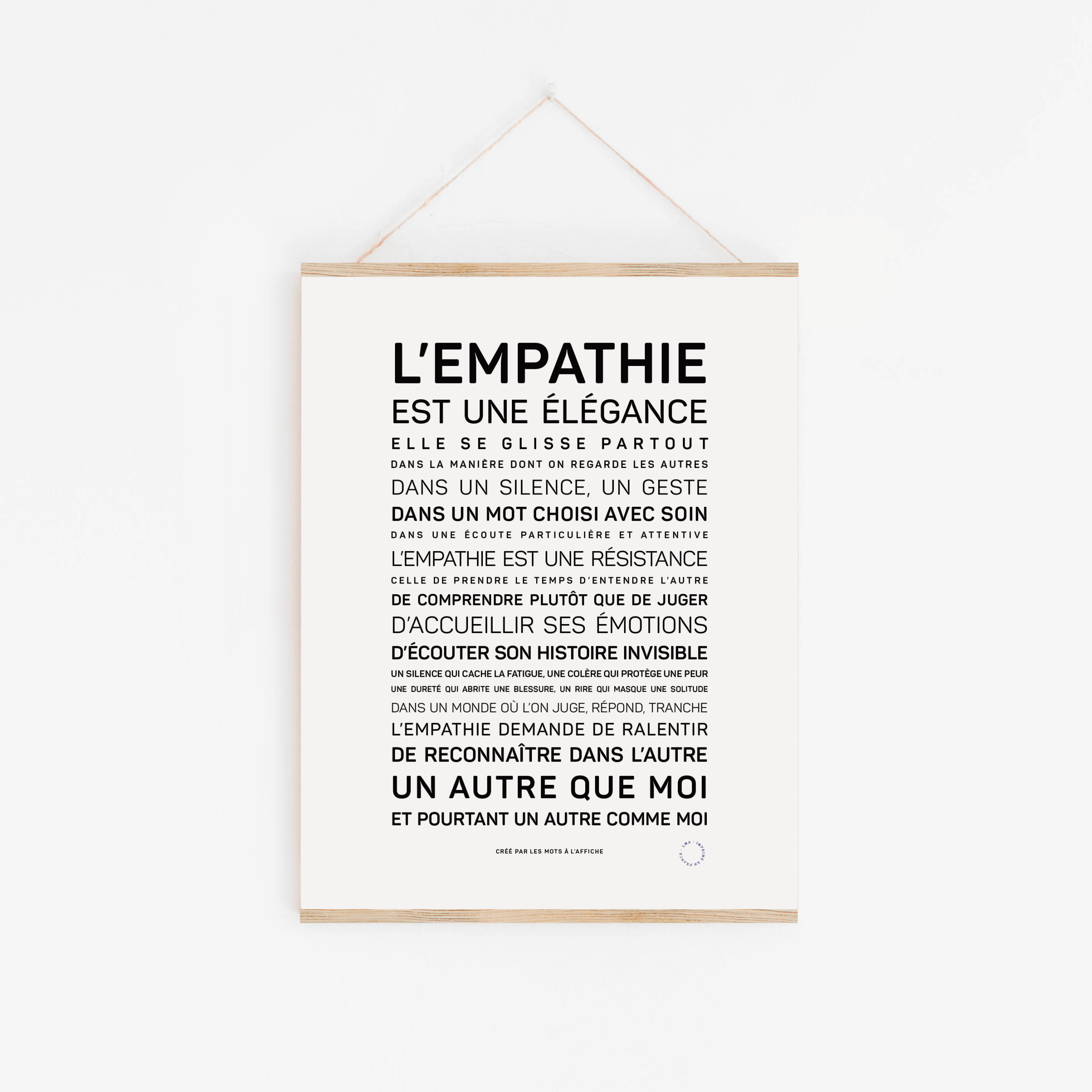 Cette affiche ne cherche pas à s’imposer dans un intérieur. Elle s’y installe discrètement, comme un point d’attention. Un rappel, peut-être, que reconnaître l’autre, dans ce qu’il a d’irréductible et de commun à la fois, est déjà une forme de soin.