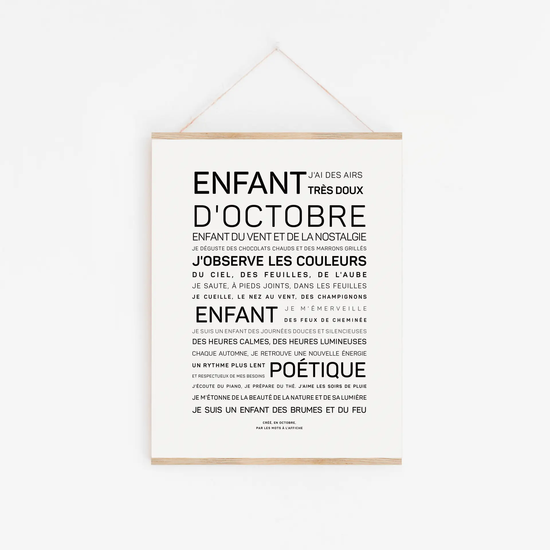 Octobre a ses enfants. Ceux qui aiment le vent, la légère nostalgie des fins de journée et la lumière qui se pose sur les feuilles. Enfant d’octobre est une affiche typographique qui célèbre les bonheurs simples de la saison: chocolats chauds, marrons grillés, brumes du matin, feu de cheminée, soirs de pluie, couleurs de l’aube.