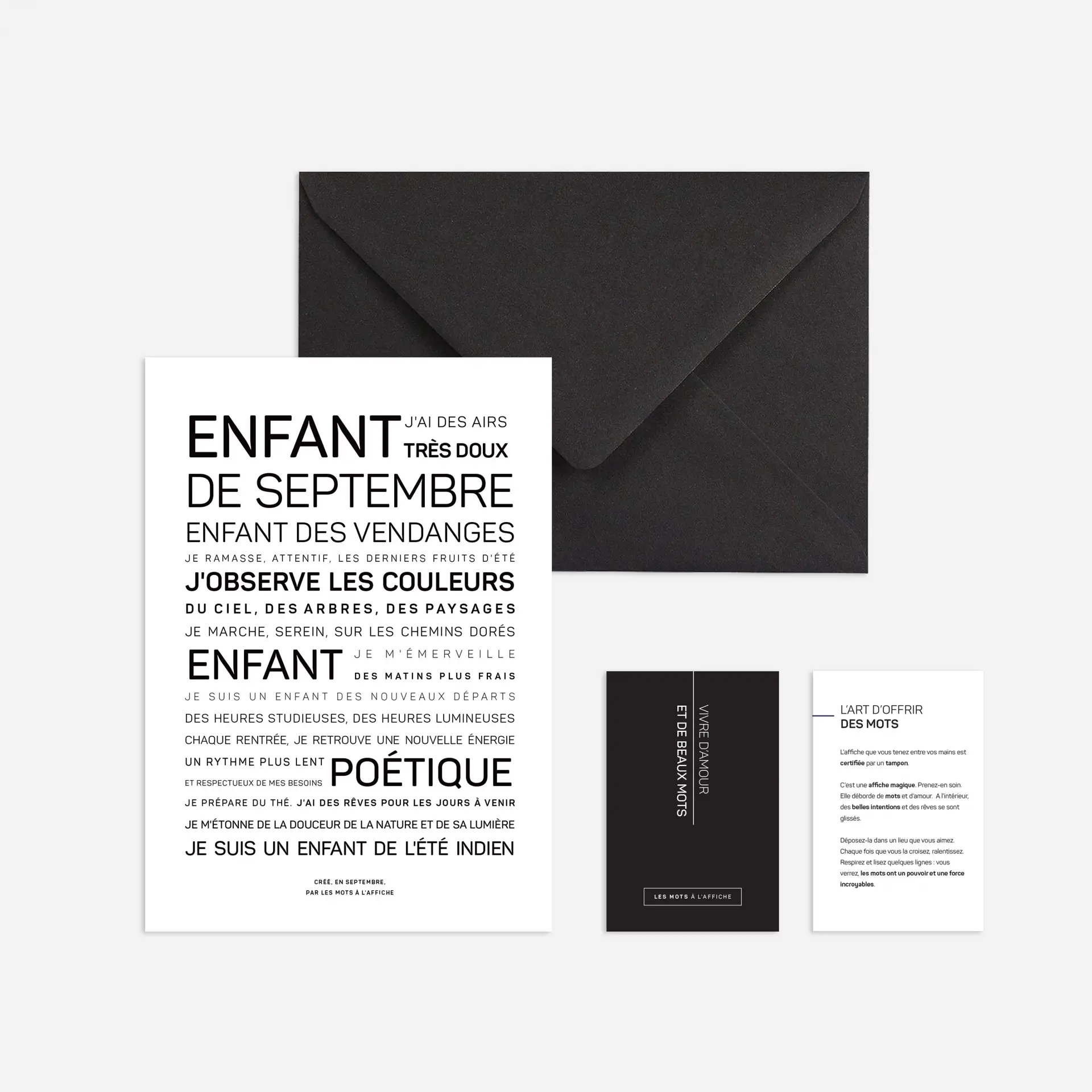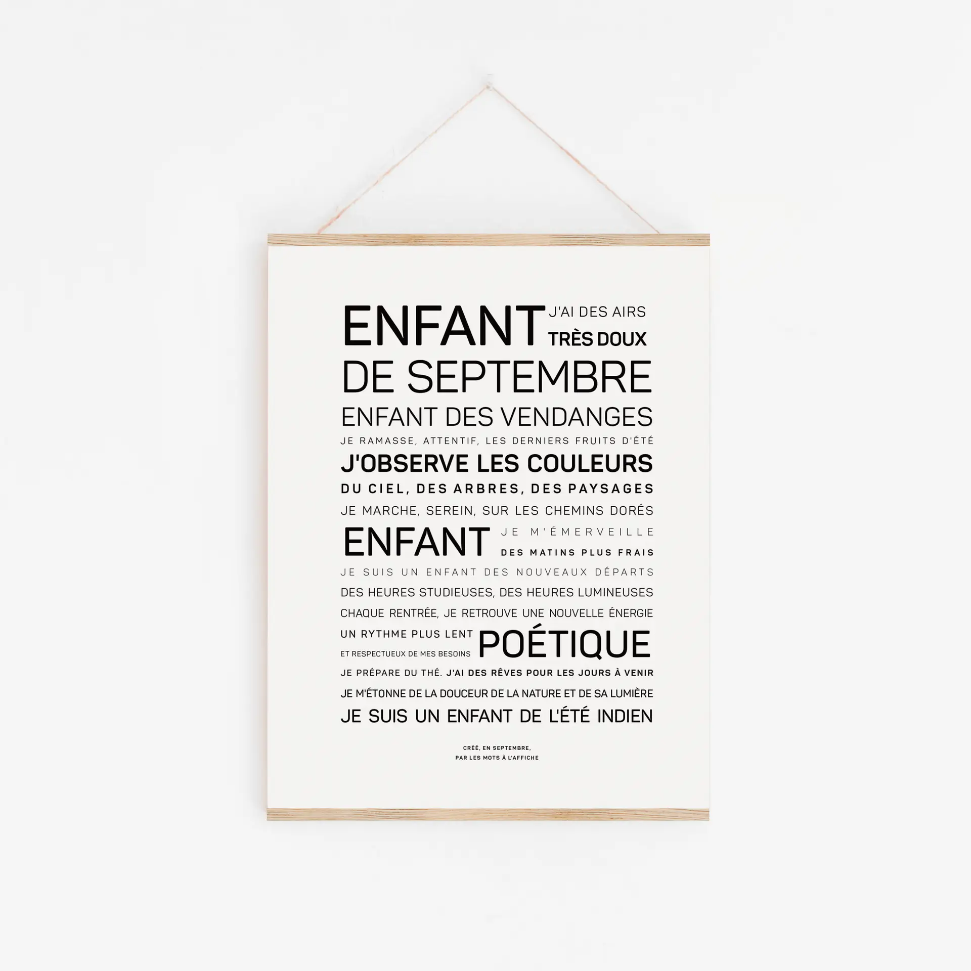 Imaginée et fabriquée en France, cette affiche typographique devient un cadeau parfait pour une naissance, un baptême ou un anniversaire en septembre. Elle trouve naturellement sa place dans une chambre d’enfant, un coin lecture, un salon lumineux ou un bureau qui aime l’inspiration. Les mots parlent d’énergie retrouvée, d’été indien, de vendanges et de ces rituels simples qui réconfortent: préparer du thé, rêver aux jours à venir, s’émerveiller de la nature.