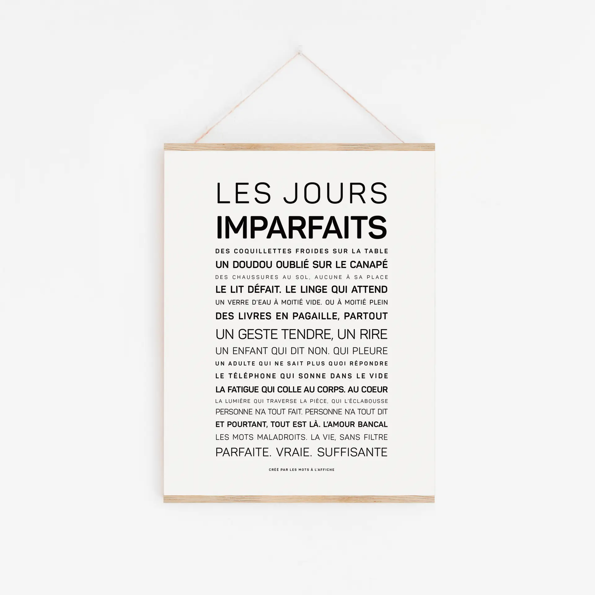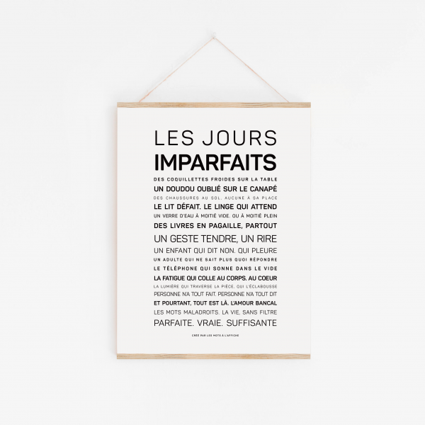 Cette affiche typographique fait partie de la collection Les jours imparfaits pensée comme un refuge. Une bulle de douceur dans une société qui exige la performance, l’image, la perfection.