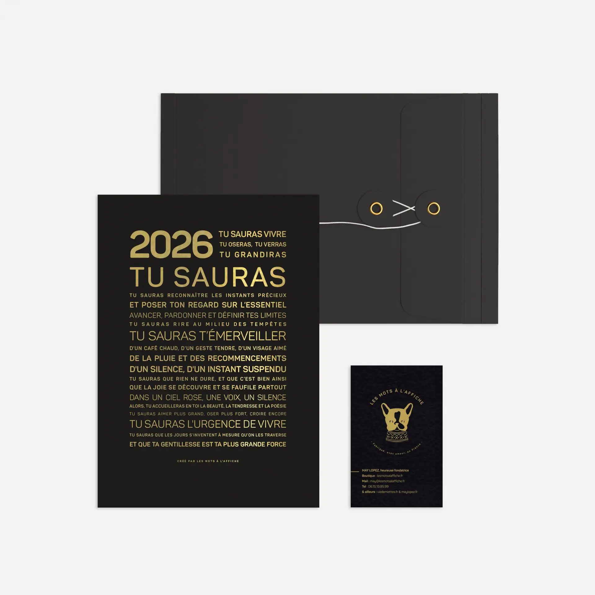 Affiche 2026, tu sauras, haut de gamme, écriture dorée sur fond noir, au format A5 (14.5 x 21), réalisée avec amour, en impression traditionnelle letter press dans le sud de la France, sur du papier old mill certifié FSC avec un léger grain.