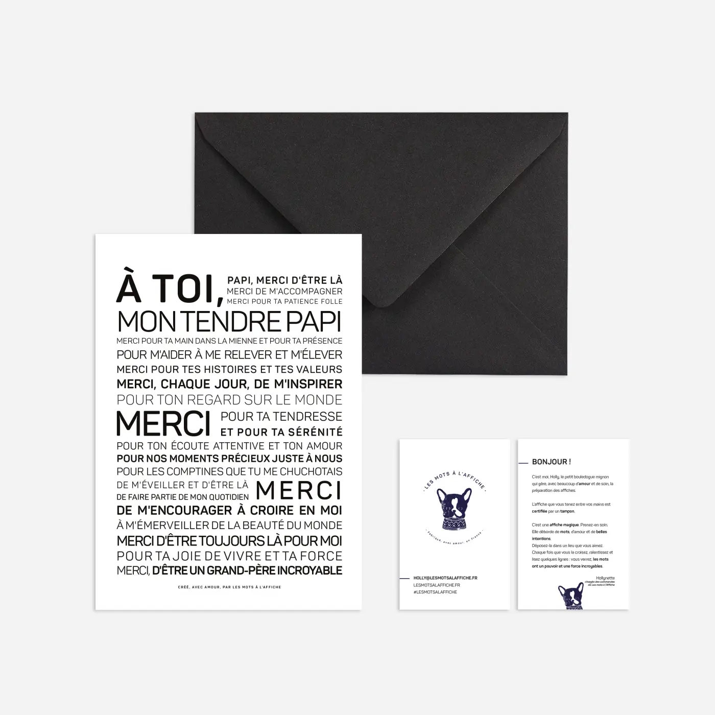 J’ai imaginé cette affiche Papi comme un cadeau pour dire à son grand-père combien il est essentiel dans notre vie . Cette affiche « papi » existe en deux versions à la première personne du singulier (à mon papi) et du pluriel (à notre papi).