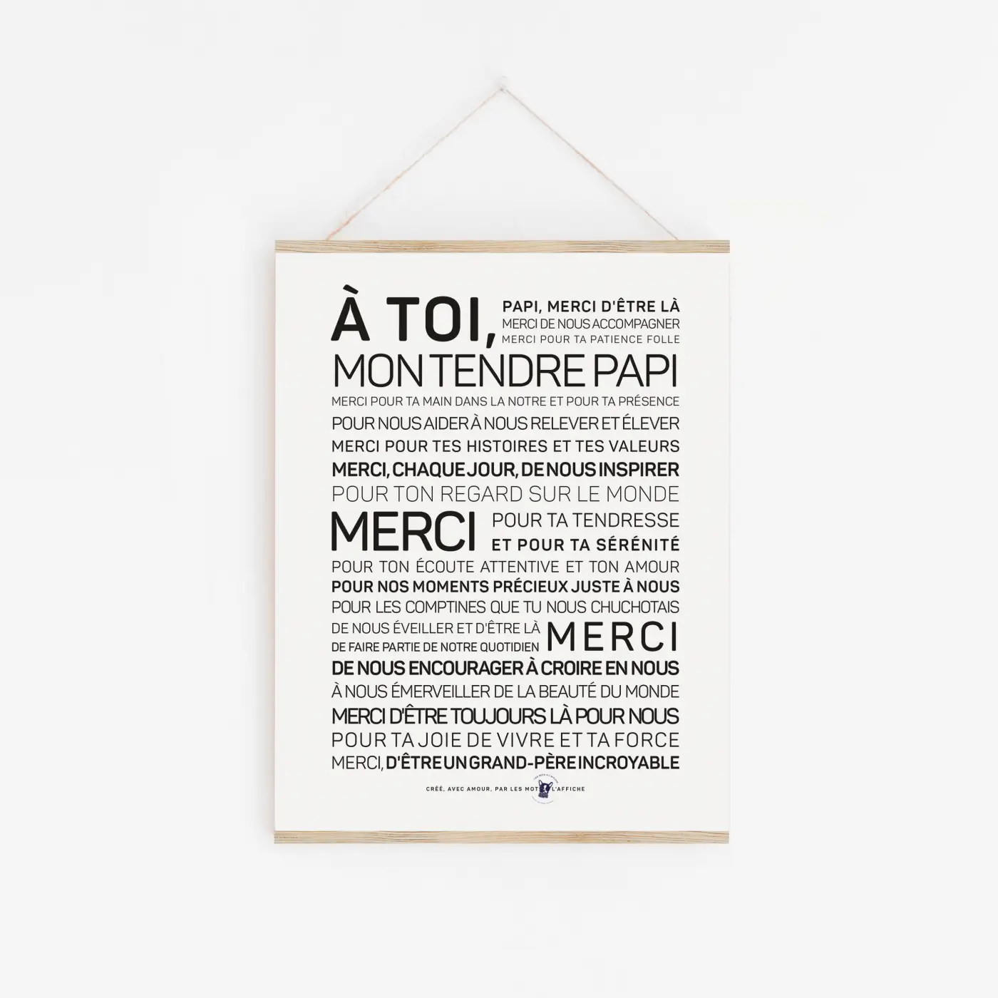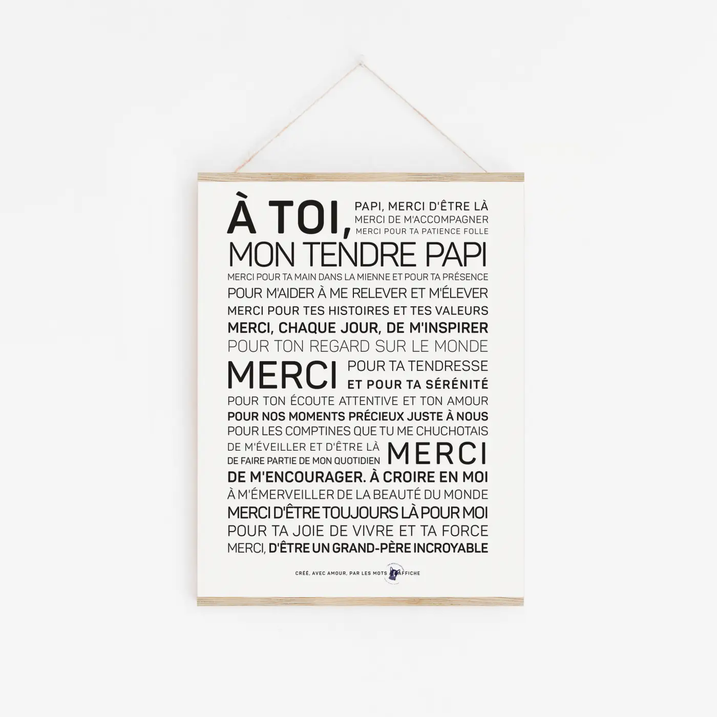 Les mots, les mots pour dire à votre papi combien vous l’aimez et exprimer toute votre gratitude. Les mots pour dire à votre grand-père combien il est merveilleux et comme vous êtes heureux de l’avoir à vos cotés. C’est une affiche pour chuchoter merci d’être un grand-père incroyable.