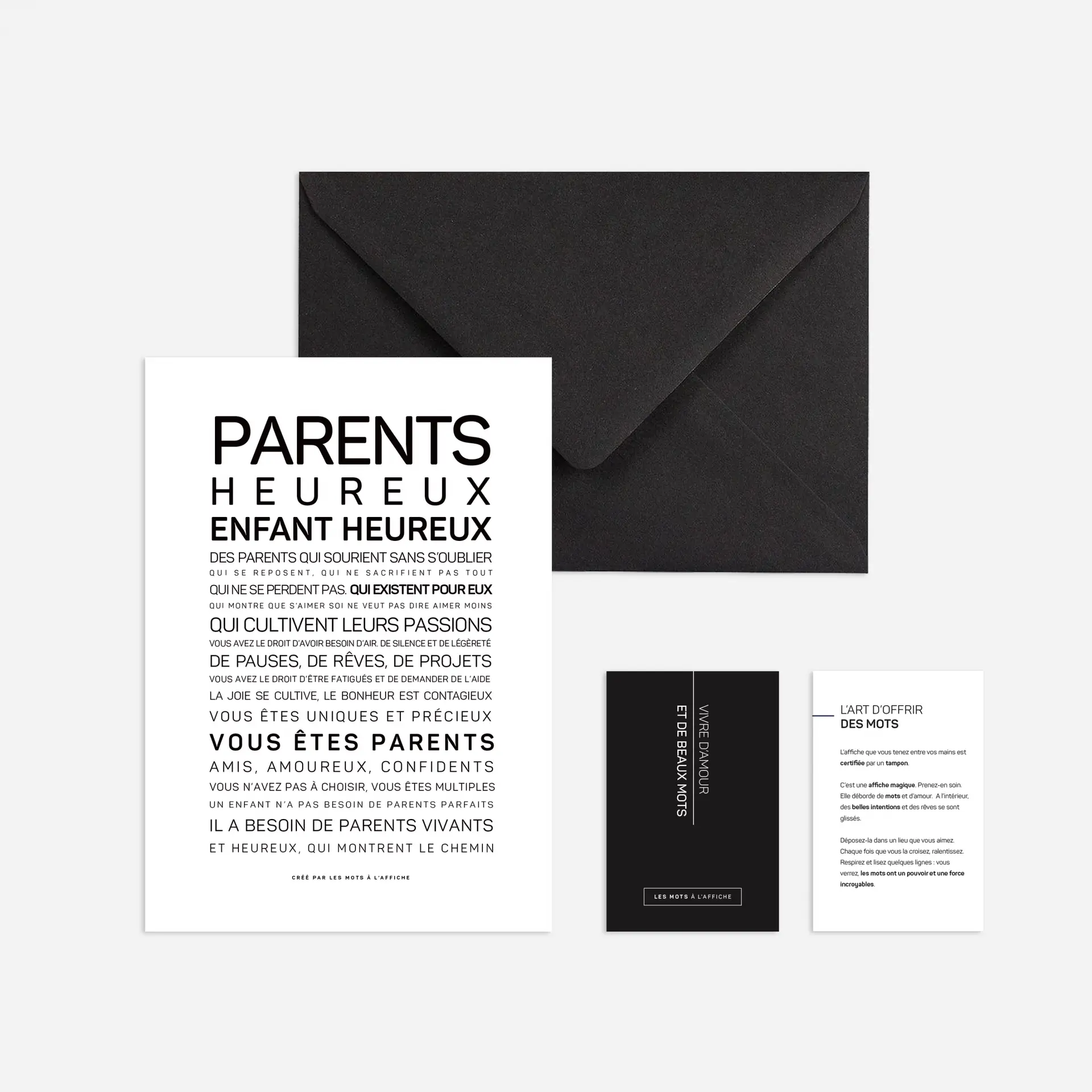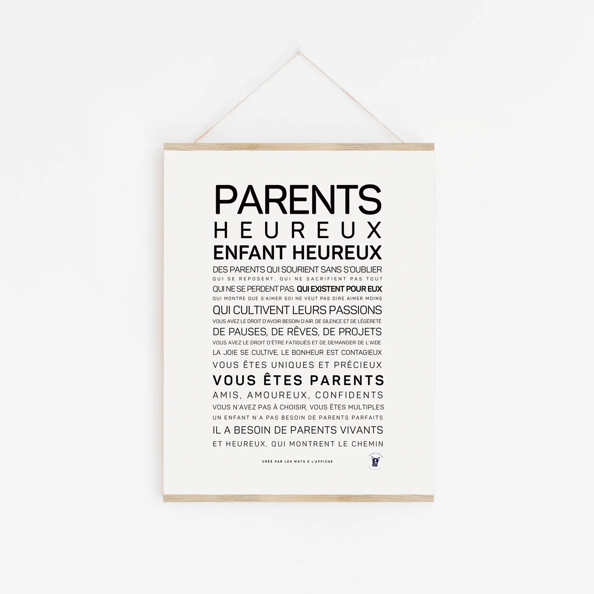 L’affiche « Parents heureux » célèbre les parents d’aujourd’hui : les mères qui ne veulent plus se sacrifier pour exister, les pères qui osent poser leurs limites, et les parents qui apprennent à s’aimer sans culpabilité.