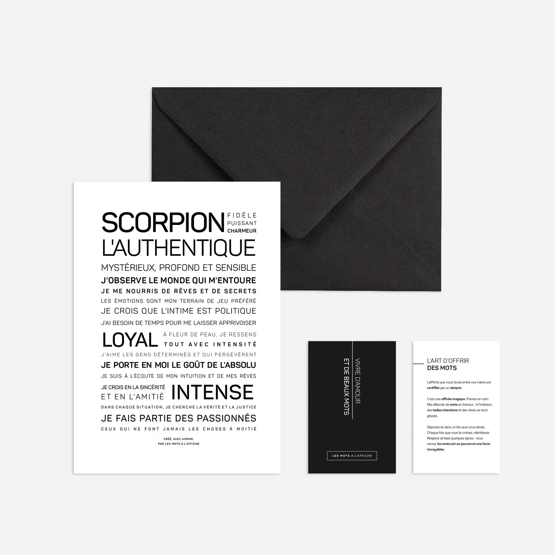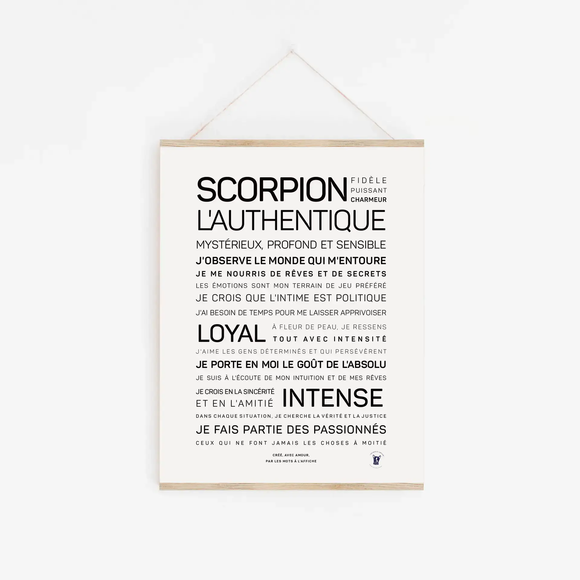 Une affiche, et des mots, sur le signe du Scorpion qui met en avant son authenticité, sa charme et son intuition. Sans oublier son besoin de passion, d’accomplissement et réflexion.