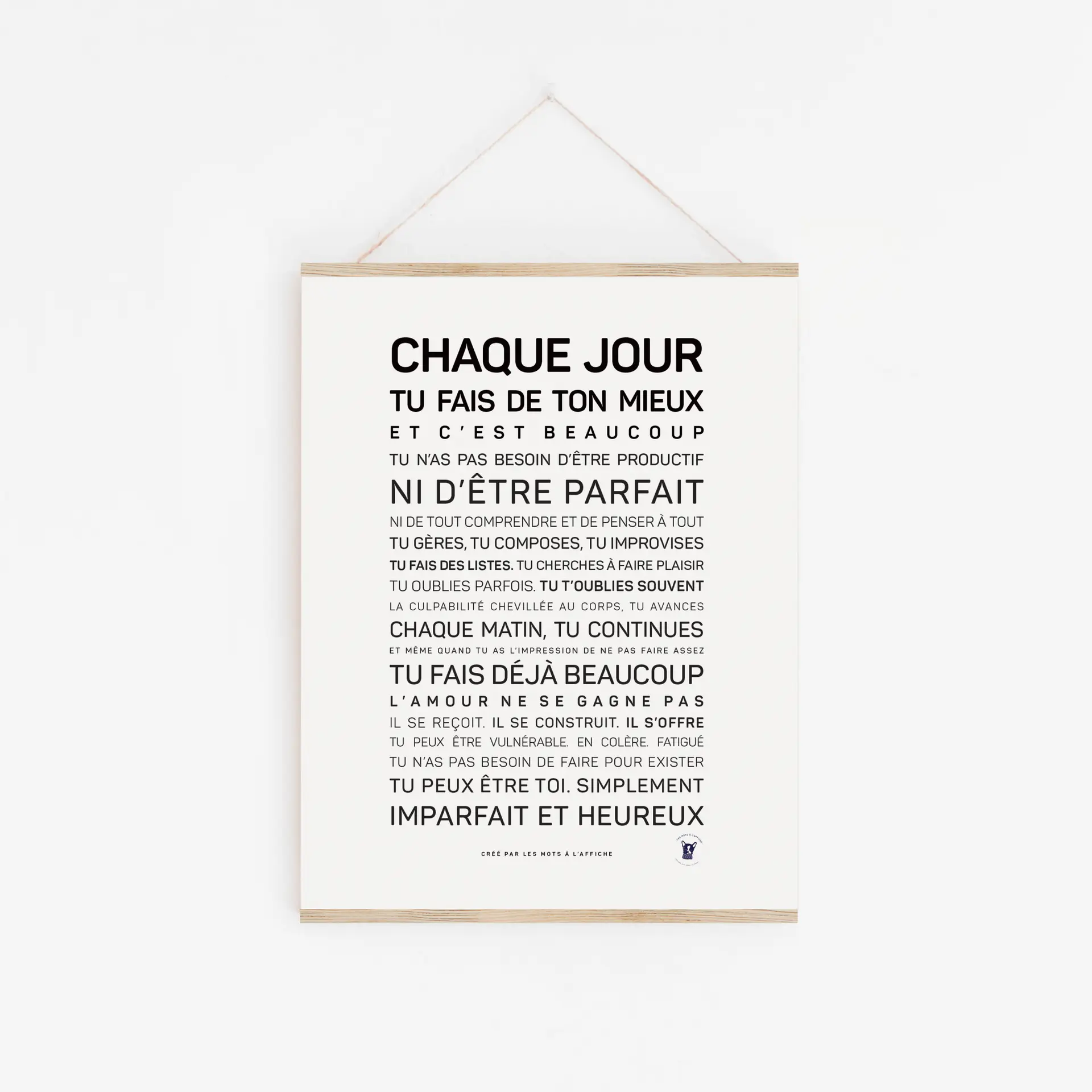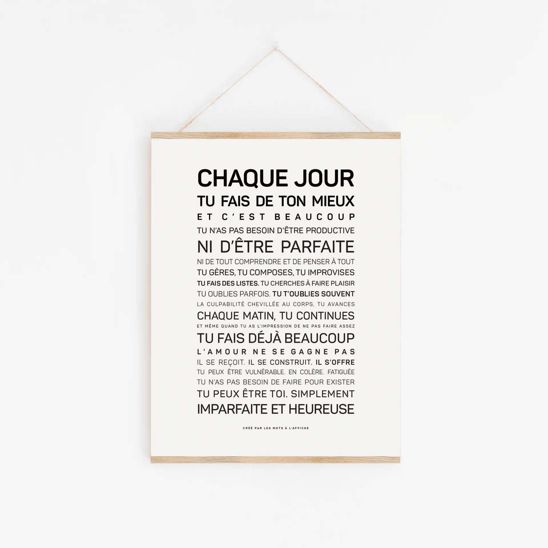 Cette affiche est une caresse. Un texte bienveillant, écrit pour toutes celles et ceux qui avancent avec le cœur lourd, les to-do listes infinies et la culpabilité en filigrane.